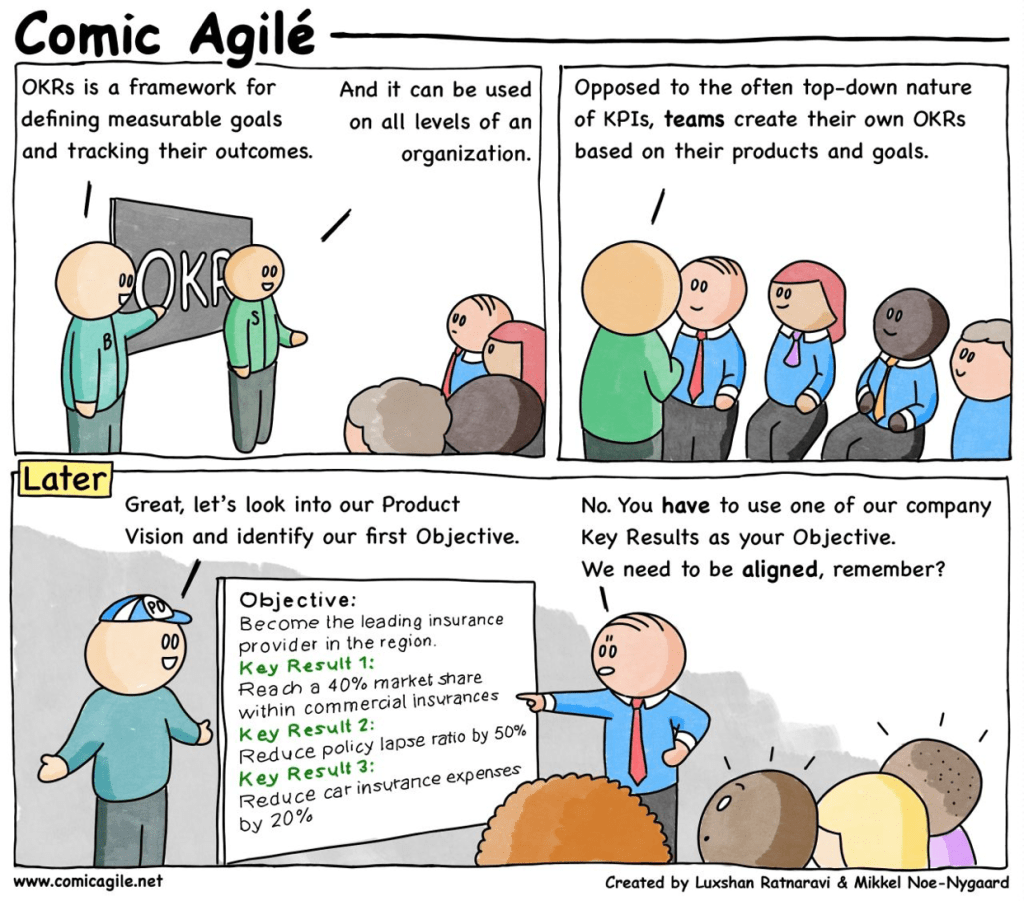 Alignment also certainly doesn’t mean that I tell people what to do or that I just take and copy OKRs from the top level. In some organisations, Objectives and Key Results are passed down from the corporate level to departments and then to teams. Some even create OKR silos, even though the reason for introducing OKR was alignment. Only because they believe that the OKR structure must reflect their current organisational structure. Sad, but true.
