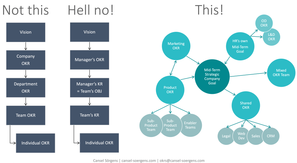 As mentioned earlier, alignment does not mean that OKR is simply cascaded down the hierarchy levels, and certainly not that Manager’s KR becomes Team’s OBJ. This kind of OKR alignment prevents autonomy, empowerment, creativity and motivation. Besides, teams have to wait until all higher levels of the hierarchy have defined their OKRs. This slows down the whole process. Consequently, any change in a KR at a top level causes overhaul of the entire plan.